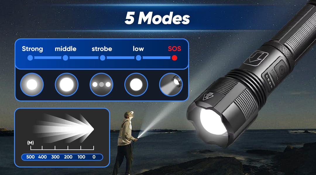 Powerful led flashlight with 5 modes: Full, Medium, Low Brightness, Strobe & SOS, you can switch at will, adapt to different environments of lighting. In addition, the zoomable function is more practical, spotlight for long range observation and floodlight for large area illumination.