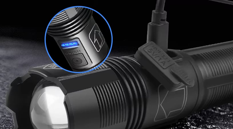 Conveniently powered up to 90 minutes! Built in Micro input port, allows you charging the led flashlight conveniently. In addition, rechargeable flashlights have a power display function, so that you can see the power at a glance.